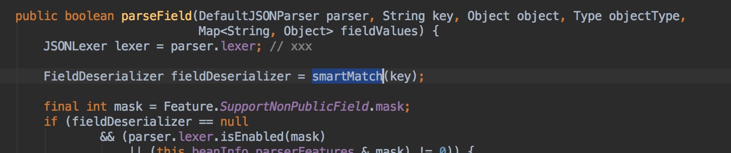 parseField里调用了smartMatch方法,这个漏洞很关键的一个点