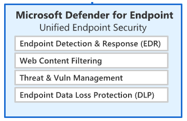 • Microsoft Defender for Endpoint (MDE) – 提供高级端点检测和响应 (EDR) 功能、Web 内容过滤、威胁和漏洞管理以及数据丢失保护 (DLP)。与云应用程序一样,Microsoft 将其与我们产品组合中的其他功能集成在一起,因此您无需运行多个代理/解决方案即可实现端点安全目标。