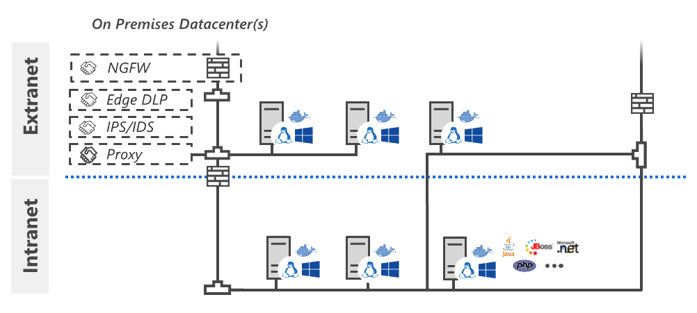 现在的大多数组织都在运行着多平台环境,使用 Windows 和 Linux 服务器,在上面运行着数据中心、容器和要保护的许多不同类型、版本的应用程序。 因此大多数组织会从网络边缘/出口点部署核心安全功能(NGFW、Edge DLP、IPS/IDS、Proxy),以保护生产网和内网的资产。