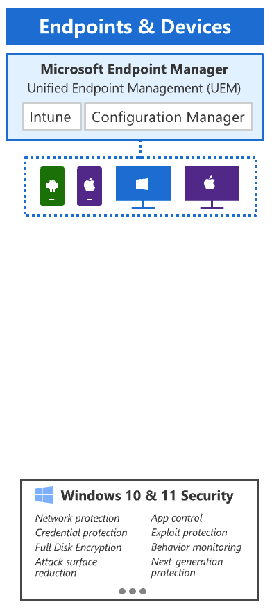 •Microsoft Endpoint Manager (MEM) 配置管理器和 Intune MDM/MAM 提供跨平台的统一端点管理 (UEM) 和跨Windows、Linux、Mac、iOS 和 Android 的安全性
