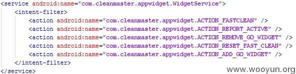 暴露了com.cleanmaster.appwidget.WidgetService服务组件,当向此服务发送action为com.cleanmaster.appwidget.ACTION_FASTCLEAN的intent时,便可结束后台运行的一些app进程