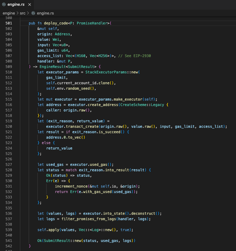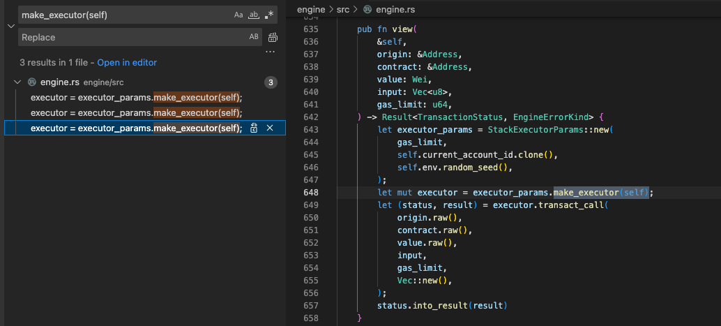 从Aurora的代码寻找会将自己设置为执行id的函数,在代码中我们找到三处,分别是deploy、call、view函数。
