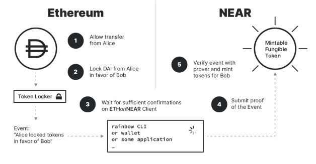 1. 假设 Alice 想在 NEAR 区块链上将 X DAI 转给 Bob,她从 RainbowCLI/RainbowLib 发起转账;