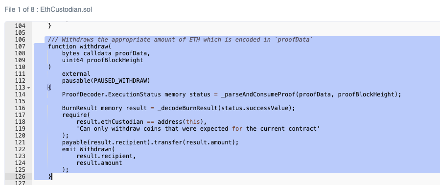 在withdraw中验证result.ethCustodian是否等于BurnResult.ethCustodian,如果相等,则执行合约转账。