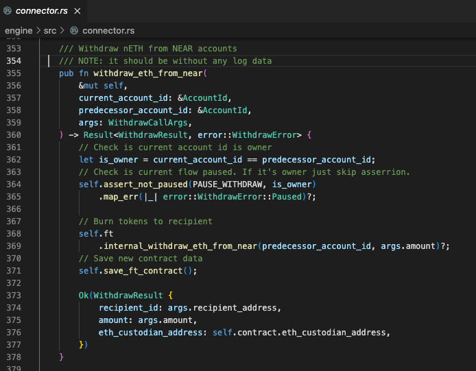 在 withdraw函数中直接调用了withdraw_eth_from_near函数,如下