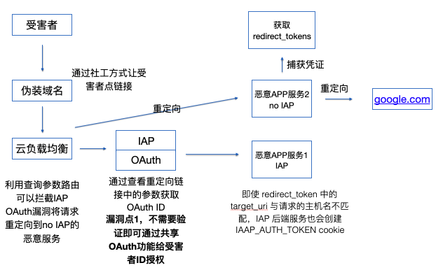根据作者的漏洞介绍,尝试着画了一下攻击路径(原文描述的有点凌乱,可能有不对的地方,见谅),大概路径是通过这三个小漏洞,利用重定向,在受害者访问开启了IAP的APP之前先重定向到没有开IAP的APP上,然后捕获链接中的token,实现凭证窃取。