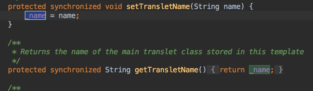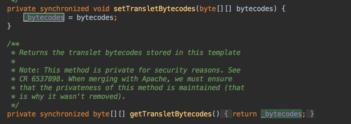 所以当fastjson发现在TemplatesImpl中找不到setBytecodes()/getBytecodes()方法时,会直接对TemplatesImpl中的_bytecodes属性强赋值,而不会去调用代码里面定义的setTransletBytecodes()/getTransletBytecodes()