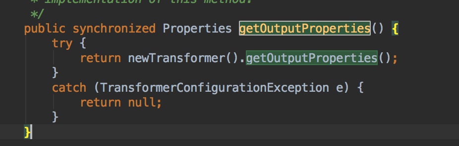 这样来看,_name和_tfactory属性的setter/getter方法的格式是不对的,因此又被fastjson强赋值,但是当遍历到_outputProperties属性时,发现存在一个getOutputProperties()方法(然而这个方法并不是_outputProperties方法的get方法),fastjson会立即执行调用该方法