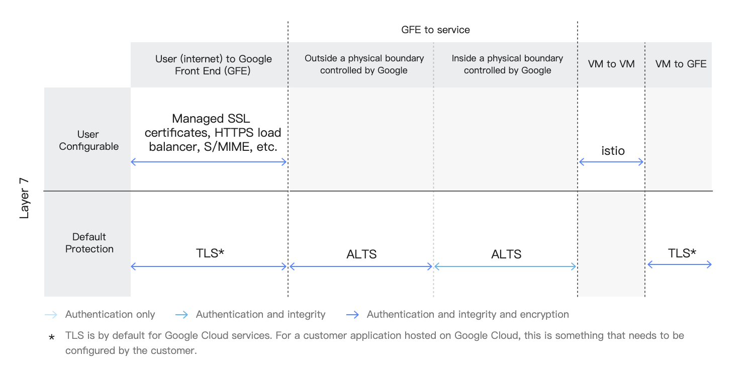 Google 使用各种加密方法(包括默认方法和用户可配置的方法)加密传输中的数据。使用的加密类型取决于 OSI 层、服务类型和基础架构的物理组件。