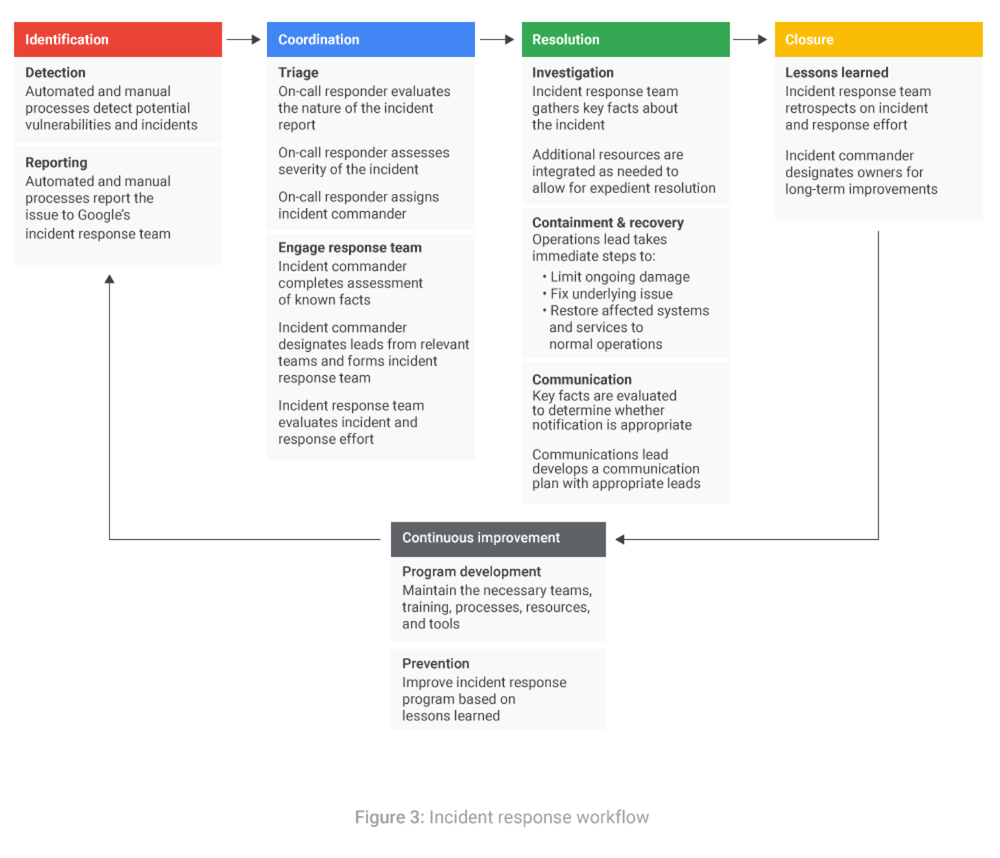 每个数据突发事件都具有特异性,数据突发事件响应流程的目标是保护客户的数据,尽快恢复正常服务,并满足监管和合同合规要求。 Google 的突发事件响应计划的流程如下: