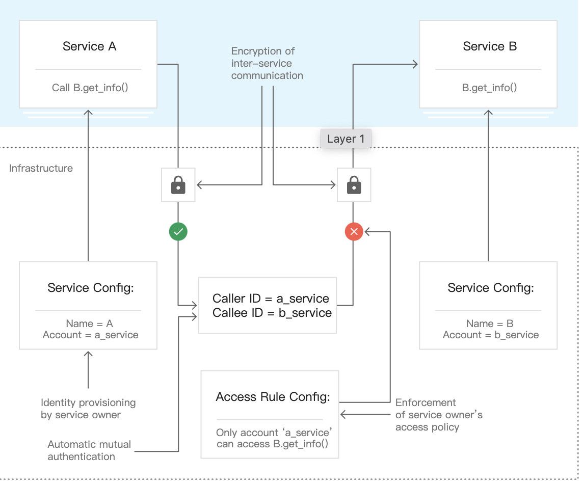 基础架构可提供服务身份、自动身份互验、服务间通信加密,并可执行服务所有者定义的访问政策。每项服务都有一个由服务所有者创建的服务配置。对于加密的服务间通信,自动双向身份验证使用调用方和被调用方身份标识。只有在访问规则配置允许的情况下才能进行通信。