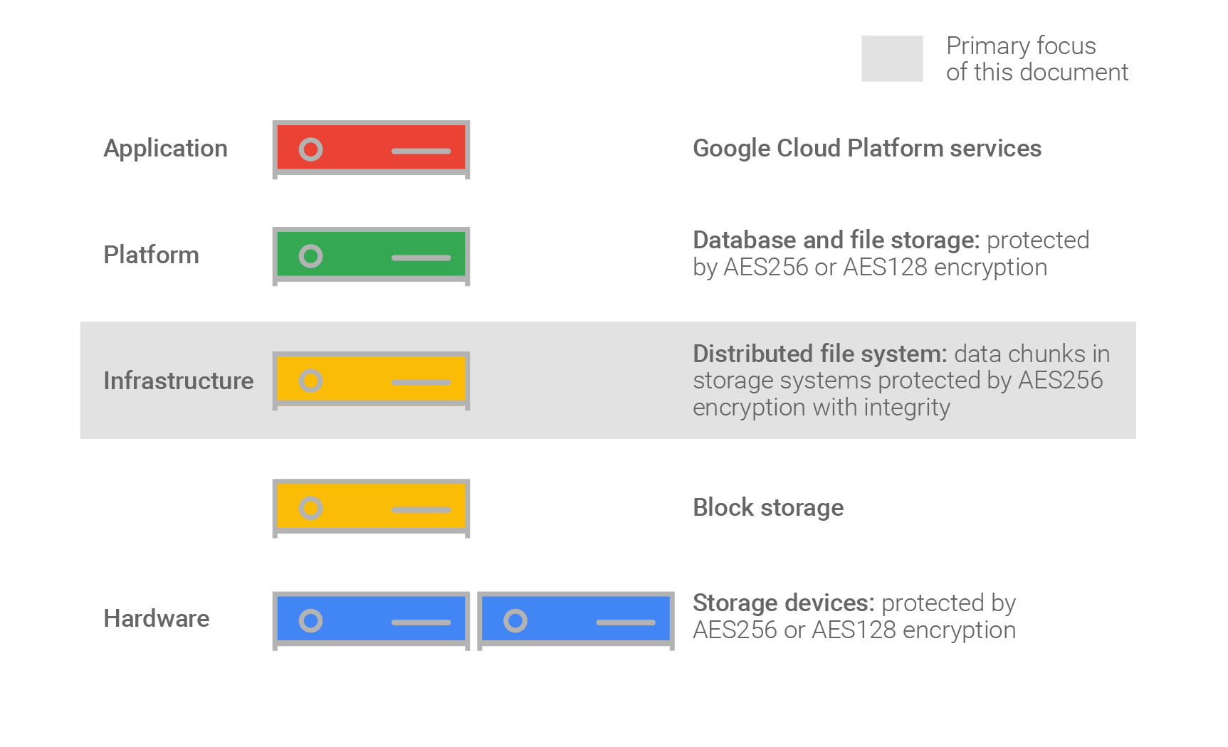 Google 的应用使用存储基础架构访问物理存储。默认情况下,存储基础架构会在用户数据写入物理存储空间之前加密所有用户数据。使用高级加密标准 (AES) 算法对静态存储的数据进行加密。