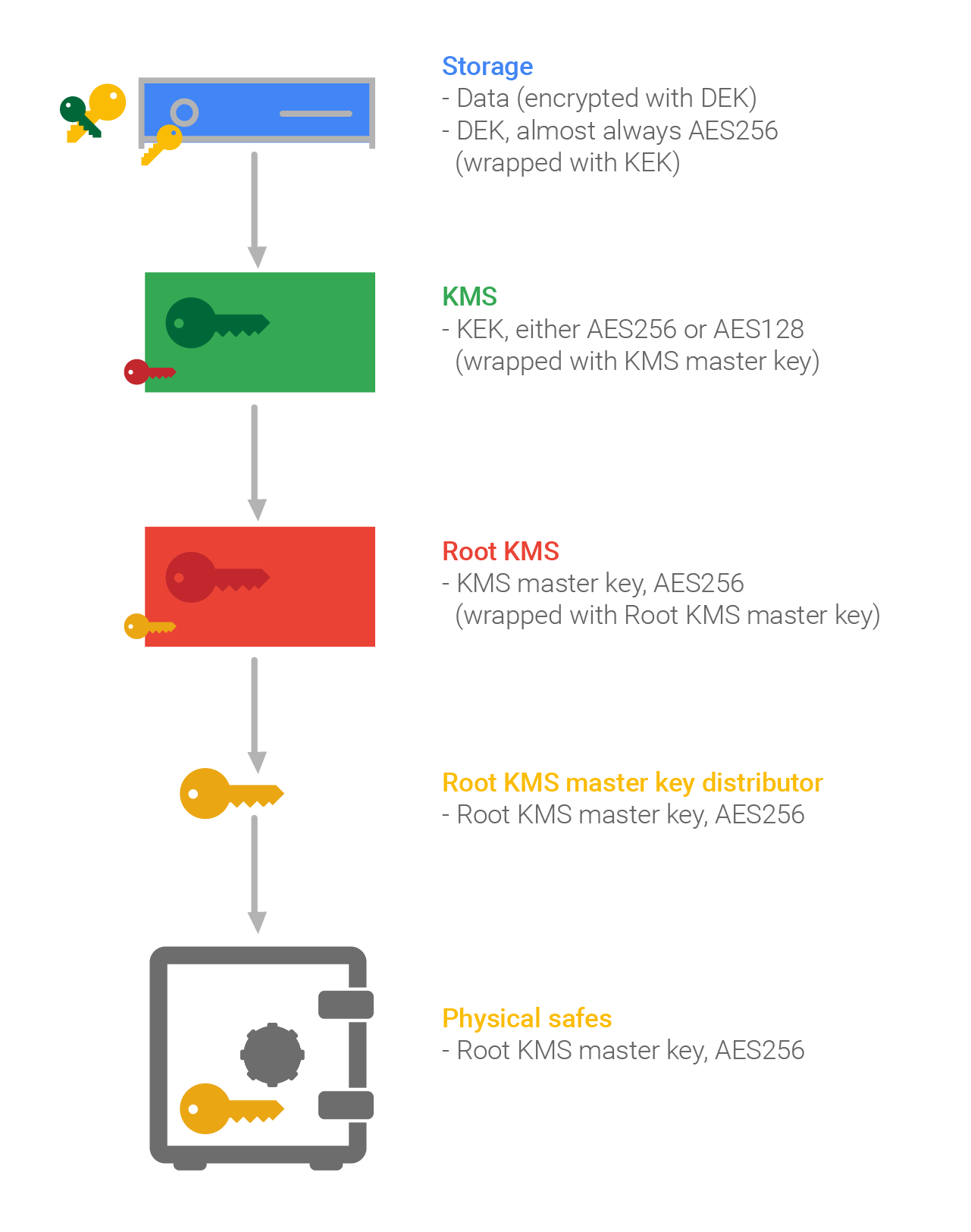 用于对块中的数据进行加密的密钥称为 DEK(数据加密密钥)。由于 Google 的密钥很多,且需要提供低延迟、高可用性的服务,因此这些密钥都存储在用其加密的数据附近。DEK 本身又使用 KEK(密钥加密密钥)进行加密(也称为“封装”)。每项 Google Cloud 服务都有一个或多个 KEK。这些 KEK 集中存储在 Google 的 KMS 中,这是一个专为存储密钥而构建的存储区。只需少量 KEK(少于 DEK 的数量)并使用集中式密钥管理服务,就能轻松管理整个 Google 中的数据存储和加密,同时还可以集中跟踪和控制对数据的访问。系统会将每位 Google Cloud 客户的所有非共享资源拆分为多个数据块,并使用客户专属的密钥进行加密。即使是同一位客户所拥有的同一部分数据,保护其各块的 DEK 也各不相同。 更多细节:https://cloud.google.com/docs/security/encryption/default-encryption?hl=zh-cn#key_management