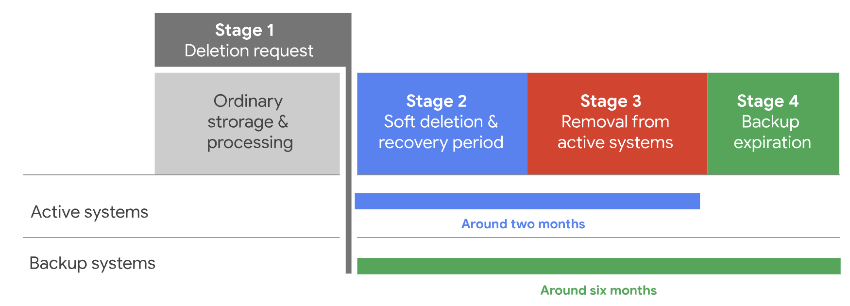 客户发出删除请求时,客户数据删除操作就会开始。通常,删除请求会指向特定资源、Google Cloud 项目或客户的 Google 帐号。删除请求的处理方式可能会有所不同,具体取决于客户请求的范围。