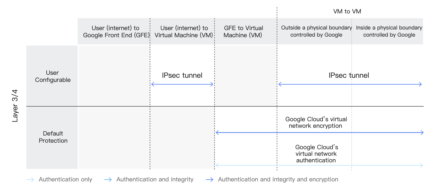 所有 Google Cloud 虚拟网络流量均经过加密。基础架构服务之间的所有通信都经过身份验证,大多数服务间通信均已加密,这增加了一层额外的安全保护,即使网络被窃听或网络设备遭到破解,也能保护通信。
