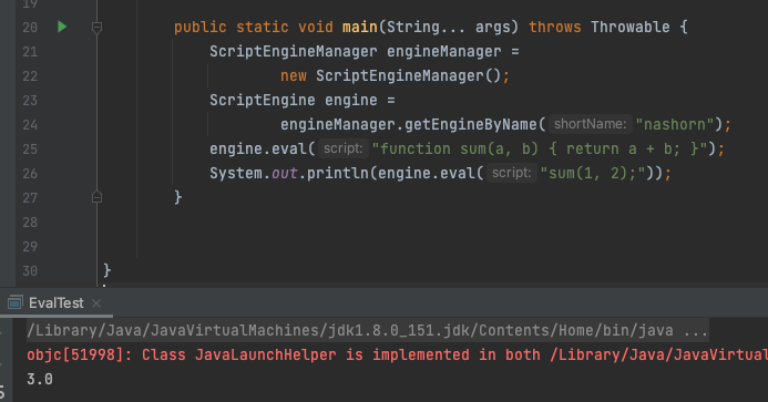 1 2 3 4 5 6 7 8 9 10 11 12 13 14 import javax.script.ScriptEngine; import javax.script.ScriptEngineManager; public class Hello { public static void main(String... args) throws Throwable { ScriptEngineManager engineManager = new ScriptEngineManager(); ScriptEngine engine = engineManager.getEngineByName("nashorn"); engine.eval("function sum(a, b) { return a + b; }"); System.out.println(engine.eval("sum(1, 2);")); } }