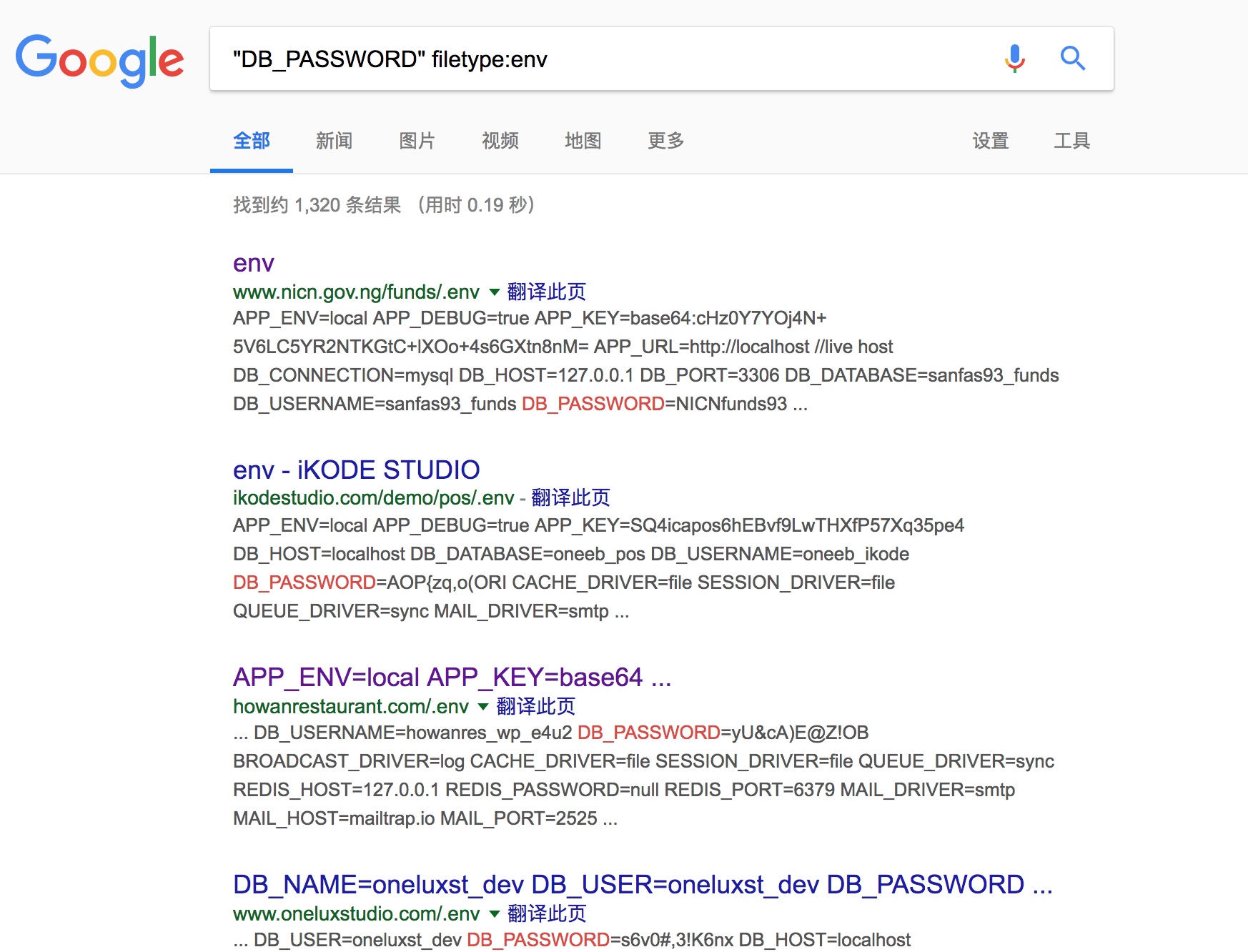 google hack "DB_PASSWORD" filetype:env
